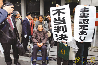 15日,東京高等法院審判長開庭不到1分鐘,便駁回了中國慰安婦長達9年之久的要求日本政府謝罪和賠償的訴訟請求。判決引起旁聽者強烈不滿,不少日本民眾在法院外聲援劉面換老人(坐輪椅者)。(新華社)