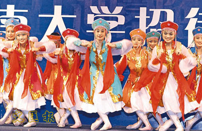 暨南大學學生藝術團為「第四屆國際華文教育研討會」的與會代表表演精彩的文藝節目,圖為學生正在表演蒙古族舞蹈《歡樂的草原》。 (中新社)