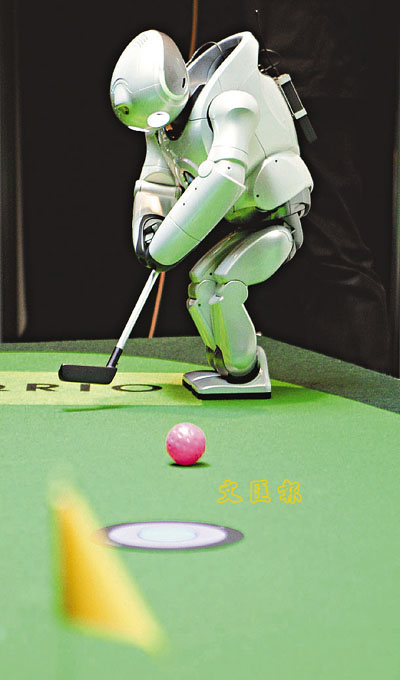 日本新力公司的人型機械人Qrio周五在東京陳列室示範打高爾夫球。 (法新社)