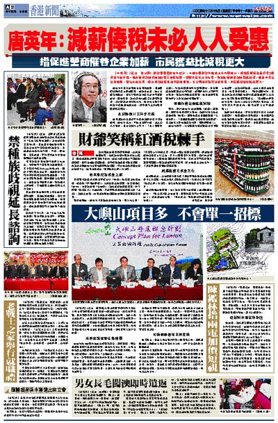被問及政府會否於下年度財政預算案中寬減稅項,唐英年認為,即使減免薪俸稅,也未必人人受惠,因為全港打工仔中,「並非個個要交稅」,倘政府促進有利的營商環境,企業賺錢後加薪及增交利得稅,反而所有打工仔都可以受惠,對政府來說也是好事。他亦表示很高興有部分大企業近期帶頭加薪。