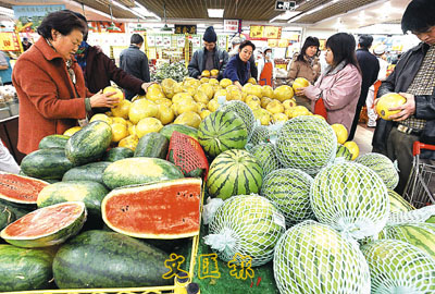 北京超市中的一角,堆滿了由日本入口的高價水果。(法新社)