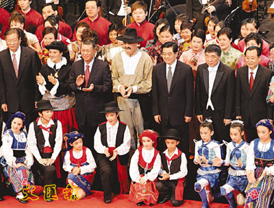 表演過後,胡錦濤與何厚鏵等一同與表演者合照。 (張立新 攝)