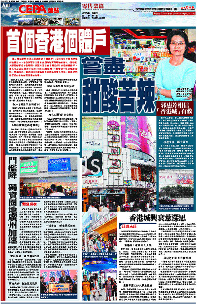 港人可在廣東申請工商牌照當「個體戶」,是CEPA中最早達成的協議之一。該政策確令大量有志到內地拓展商機的港人,紛紛進入廣東省經營小型商舖。郭惠芳是首位「v正牌」的香港個體戶,開業地址選在廣州旺地的「CEPA香港城」。經過近一年的甜酸苦辣,郭惠芳說,雖然CEPA商機並非如想像般唾手可得,但依然深信這裡必有她創業發展的空間。