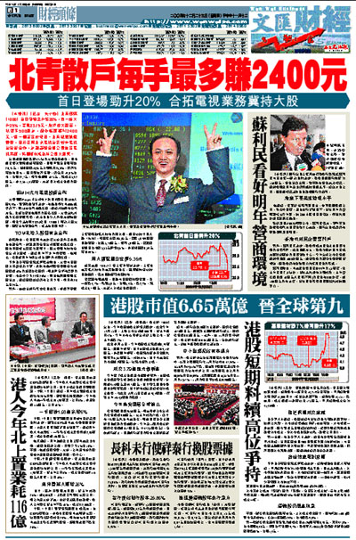【本報訊】(記者 朱小璇)北青傳媒(1000)首日登場急升近20%,曾一度大升25%,高見23.75元。散戶皆大歡喜,以每手500股計,最多帳面獲利2400元,過一個富足的聖誕。北青總裁孫偉透露,目前正與北京電視台及省外電視台洽談合作,計劃籌組合資公司涉足電視業務,集團傾向成為新公司大股東。