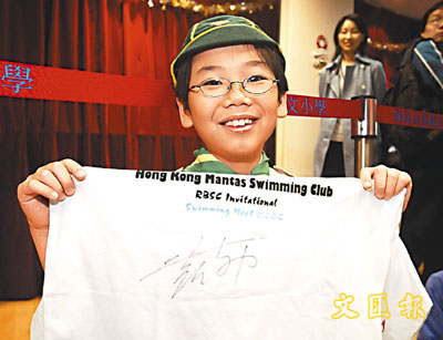 就讀張凝文小學5年級的學生梁鎮庭展示出彭勃的簽名T恤,表示要好好珍藏,他說:「能近距離見到金牌運動員,好幸福啊,以前覺得彭勃個樣好惡,現在就覺得佢好好人,我以後都要好似彭勃一樣吃苦耐勞!」