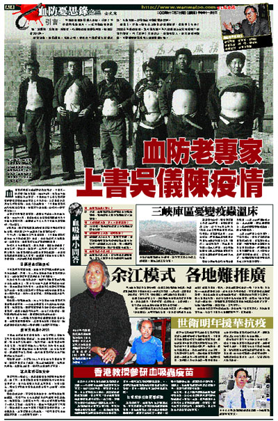 老專家的呼籲震動高層。胡溫立即推出一系列血防新政:2004年2月,國務院成立由吳儀副總理掛帥的中央血防領導小組。撤銷達18年之久的中央血防領導機構,得以復生。