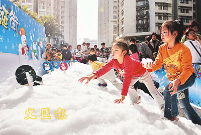 【本報訊】想到外地過一個白色聖誕?恐怕趕不及了,不如到黃埔真雪聖誕街,看看真雪,感受一下濃濃的節日氣氛吧!小朋友坐在水泡上,由70呎長的真雪滑梯滑下來,感覺好「High」:「很喜歡雪,因為雪好好玩。」大朋友小朋友還可以擲雪球及砌雪人呢!
