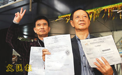 簡孝明(左)及鄧潤廉在灣仔完成入稟程序後感到高興,簡孝明更舉起勝利手勢。