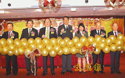 左起:劉宗明、林建高、鄔維庸、鄧國威、尤桂莊、陳偉南、蔡衍濤齊為「中西區長者健康服務計劃啟動典禮暨敬老聯歡會」主持剪綵。 (鄭群 攝)