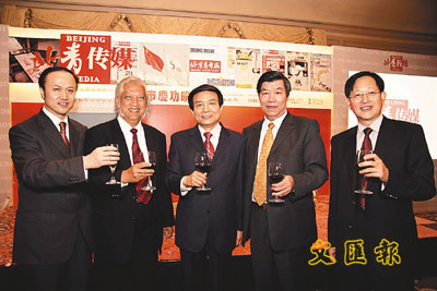 【本報訊】(記者 張萍)開啟中國內地媒體來港上市先河的北京青年報旗下「北青傳媒」,日前在中環麗嘉酒店擺下慶功宴,酬謝各路賓朋和功臣。北京市委常委、宣傳部部長蔡赴朝、共青團市委書記關成華、新華社亞太分社社長薛永興、遠道而來的本報戰略合作夥伴、美國國際日報報業集團主席熊德龍、本報總經理仇學忠等傳媒嘉賓,以及本港金融界翹楚與北京青年報社長、北青傳媒董事長張延平、總裁孫偉等管理團隊歡聚一堂。
