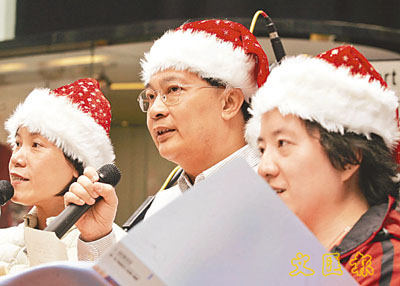 譚耀宗在街上唱聖歌,與市民慶祝佳節。(張立新 攝)