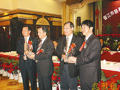 香港晉江同鄉會會長蘇千墅(右二)為洪祖杭代領了晉江市市長楊溢民(右一)頒發的「晉江慈善大使」獎盃。 (林志鴻 攝)
