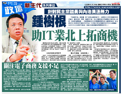 「資訊科技已經與市民的生活息息相關,電腦也成為每個人生活的一部分。究竟我們的社會怎樣有效運用電子政府和電子商貿,令香港處於領先地位,不會給內地城市淘汰?特區政府在這方面沒有詳細研究。」談到目前香港資訊科技的情況,從事資訊科技業20多年的民建聯資訊科技及廣播事務副發言人鍾樹根滔滔不絕,並批評政府在推動電子商務和電子政府方面關注不足,支援不夠。