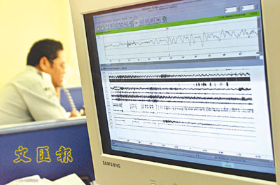 印尼雅加達氣象局周日錄得里克特制8.9級大地震,圖為電腦熒幕上的地震圖讀數。(美聯社)