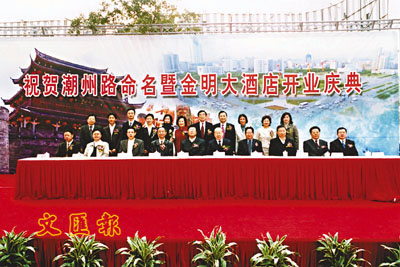 出席慶典的還有上海市、潮州市及上海潮汕聯誼會有關方面的負責人。據不完全統計,上海有數十萬潮籍鄉親,兩百年前上海就有潮人的聯誼組織。上海潮州路於2003年1月9日獲上海地名管理辦公室批准命名,於2004年秋建成通車,該路東起真華路,西迄曹楊路,全長達1公里。此路之建設開通,對於改善城市交通,方便居民出行,推動城市經濟作用重大。而金明大酒店,則是金明投資集團投資興建的三星級酒店,總建築面積一萬六千平方米。酒店之落成,將為上海普陀區的服務及旅遊業注入新活力。