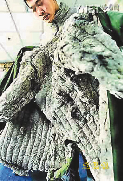 【本報訊】據《北京青年報》27日消息:京城一些黑心商販瞅準氣溫驟降這一時機,用發暗發淡的棉花,且夾雜著頭髮絲、碎布頭、土沙顆粒和許多不知為何物的黑色小顆粒的黑心棉絮(見圖)做成棉大衣出售。據悉,這些棉大衣質量一般,但非常便宜,零售一件也就是30元左右,批發一件20多元,工地的民工和一些保安都喜歡購買。昨天,在位於大紅門附近的果園服裝批發市場內,就發現有黑心棉做成的大衣出售。