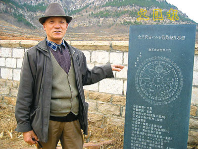 肥城市文化館程兆奎向記者介紹,日本學者為范蠡所立下的金玉良言石碑。 (殷江宏攝)