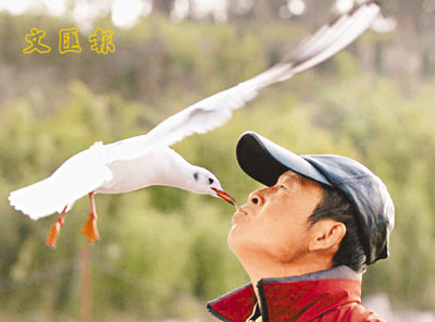 顧兵是昆明世博園的管理人員,因能零距離親近紅嘴鷗而被譽為 「鷗王」。他4年如一日地照顧園內的紅嘴鷗,盡享與紅嘴鷗和諧共處的歡樂。 (新華社)
