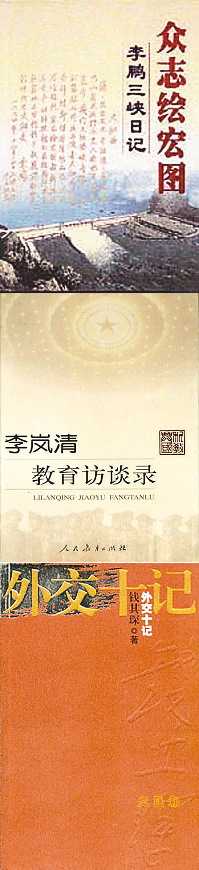 《眾志繪宏圖─李鵬三峽日記》、李嵐清回憶錄─《李嵐清教育訪談錄》和錢其琛回憶錄─《外交十記》。(網上圖片)