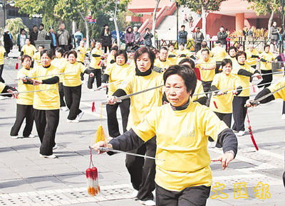 【本報訊】(記者 羅敬文)天氣仍然寒冷,但自由黨轄下的自由之友昨日仍精神奕奕,逾百名成員在寒風之下「舞刀弄劍」,運著內勁,使出柔中帶剛的太極劍招和拳法,驅走陣陣寒氣。自由黨主席田北俊笑言,太極老少咸宜,並非長者專利,即使年紀輕輕也可參加。