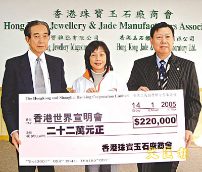 【本報訊】(記者 鄭群)香港珠寶玉石廠商會理事長陳聖澤、理事余錦坤昨代表商會向香港世界宣明會遞交22萬元善款支票。香港珠寶玉石廠商會日前就南亞地區災難性地震及海嘯向會員展開募捐行動,除商會撥捐善款外,亦得到會員商號的鼎力支持,支票移交儀式昨於該會紅磡辦事處舉行,由香港世界宣明會副總幹事丁美珠代表接收。