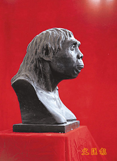 根據周口店龍骨山岩洞裡發現的北京猿人化石復原的「北京人」女性像側面。(資料圖片)