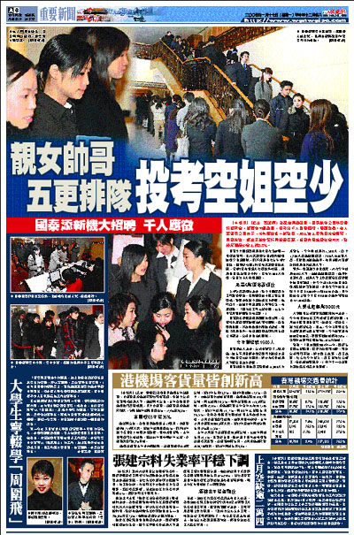 大部分求職者均表示,對空中服務員的工作極感興趣,並指隨著迪士尼主題公園落成,看好本港航空及旅遊業的發展。他們當中,包括中學及應屆大學畢業生。有應徵說:「現在找工作比較容易,比上年師兄師姐所面對的境況好。」