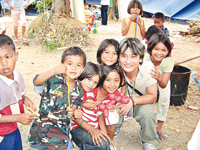 義務社工陳萬聯應帶了許多氣球送予當地的小孩,他相信遊戲是治療小孩心靈創傷的最佳辦法。