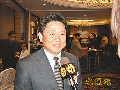 金華市市長徐止平在會議現場接受訪問。 (楊奕霞 攝)
