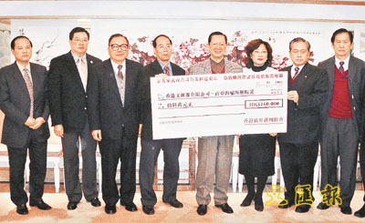 左起:劉偉忠、陳幼南、陳金烈、張晴雲、陳有慶、劉永碧、余國春、王欽賢在支票遞交儀式上。 (鄭群 攝)