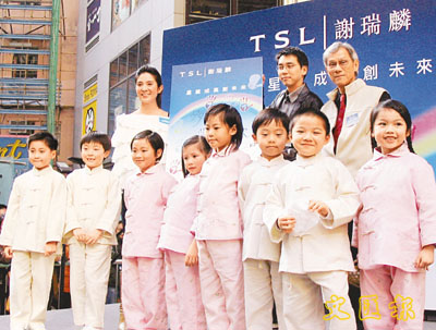 聯合國兒童基金會及TSL謝瑞麟舉辦、協助內地貧困兒童重返校園的「星願顯祝福」慈善籌款活動完滿結束,基金會香港委員會主席馮慶彪(後右)、基金會大使楊采妮及多名兒童將感謝咭送給謝瑞麟執行董事陳偉康(後中)。
