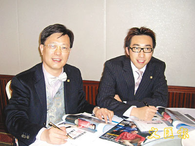 康泰旅行社董事長黃士心與擔任公司助理市場經理的長子進達,昨齊齊出席記者會,並向記者派發兩人早前接受訪問,大談經營旅行社之道的雜誌。隨後,兩人更應記者要求,在雜誌上簽名留念。 (鄧愷欣 攝)