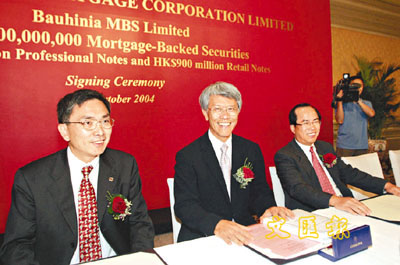 按揭證券公司總裁劉怡翔(左)與金管局總裁兼按揭證券公司副主席任志剛(中)、匯豐銀行總經理柯清輝合攝。 (資料圖片)