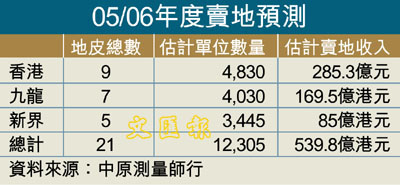 【本報訊】(記者 梁悅琴)04/05年度賣地成績遠比預期理想,中原測量行董事總經理黎堅輝相信,05/06年度會再加入10幅住宅及商業用地,當中包括北角油街、荷李活道警察宿舍、中環街市、半山波老道、西九龍兩幅住宅地、廣播道1號、九龍灣啟祥道商業用地、沙田石門及馬鞍山住宅地,令土地儲備表內可供勾出土地增至21幅,並預期當中會有7幅成功被勾出,令庫房收入料達193.98億元。