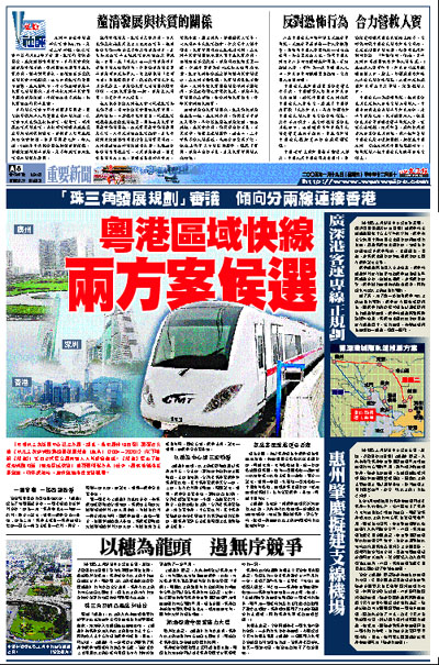 【本報珠三角新聞中心記者方廣、胡進、吳玫廣州18日電】醞釀已久的《珠江三角洲城鎮群協調發展規劃(草案)(2004-2020)》(以下簡稱《規劃》)近日正式提交廣東省人大常委會審議。《規劃》提出了穗深港城際軌道(粵港區域快線)的兩個候選方案;此外,廣佛地鐵將延至肇慶,條件成熟時,惠州肇慶將建支線機場。