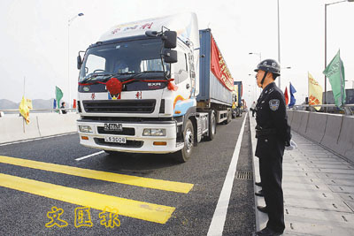 大會特別安排貨車通過落馬洲皇崗口岸新跨界橋,象徵大橋正式啟用。 (劉國權 攝)