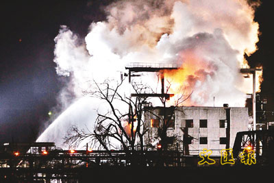 北京朝陽區一座化工廠周二凌晨爆炸起火,消防人員趕到現場噴水滅火。 (路透社)