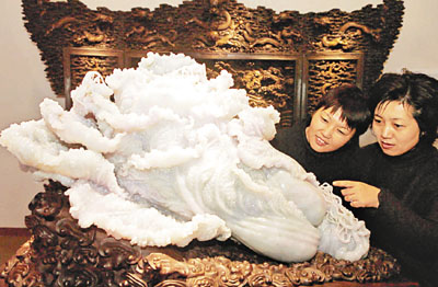 京城百年老字號北京工藝懋隆工藝珍品預展會在北京工藝懋隆藝術館舉行。圖中工藝珍品翡翠「白菜王」長98厘米、寬66厘米、高52厘米、重150公斤,由中國工藝美術大師江春源歷時兩年半設計製作而成。 (新華社)