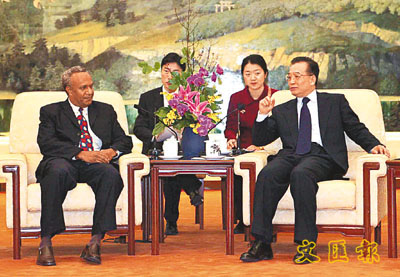 溫家寶18日在北京會見瓦努阿圖副總理兼外長薩多.基爾曼。 (中新社)