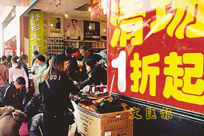 歲末年終,福州商家又展開降價大比併。圖為繁華的商業街上一家品牌店也以低價招攬顧客。 (言申 攝)