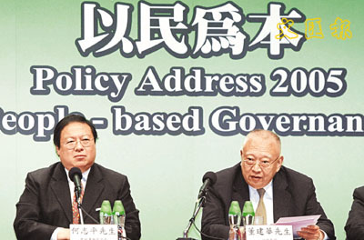 特首董建華(右)出席05年施政報告首場座談會,旁為民政事務局局長何志平。 (羅蘭蓉 攝)