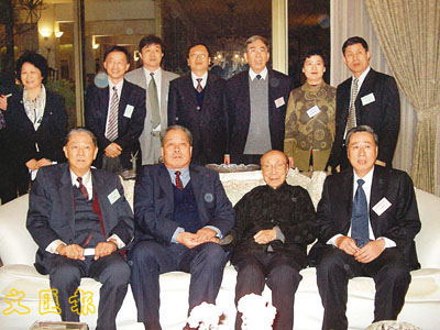 邵逸夫與基金會顧問馬臨教授(前左一)、國家教育部張保慶副部長(前左二)、教育部國際司曹國興司長(前右一)、中聯辦王國力副部長(後右三)及中聯辦同事在晚宴上合影。 (方芳 攝)