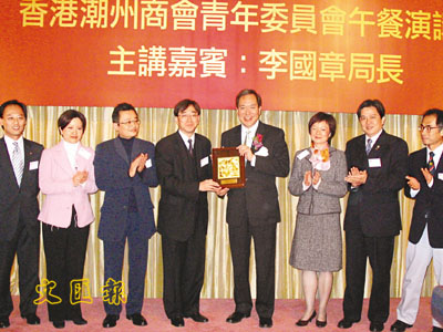 李國章盡展幽默一面,甫發言便鄭重向商會「道歉」說:「我們做教育的,積極推動兩文三語,不過真要向你們道歉,今天並無包括潮州話,可能遲些吧!」商會青年委員會主任高永文讚揚李國章處理教育問題及於立法會上的表現,都顯出不畏政治衝擊的風範。