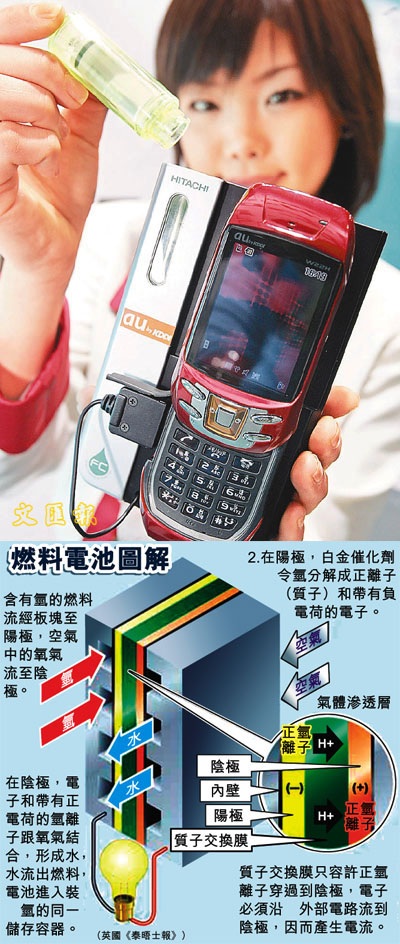 日本周五舉行首個「燃料電池博覽會」,日本電器公司日立的工程師展示新的微型燃料電池,包括一個比打火機稍小、裝著液態燃料的膠罐,膠罐插入比一包香煙稍大的金屬盒。這個燃料電池將於約18個月內在市面有售,可維持相等短途飛行時間的運作。
