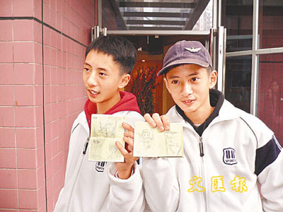 大孖陳柏熙(左)和細孖陳效添重拾自信,向記者展示他們的畫作。