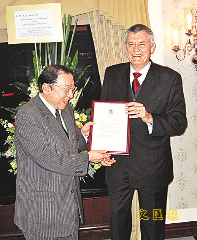 比利時駐港總領事奈斯(右)向楊國琦頒授皇室武士勳爵證書。