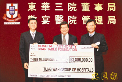 【本報訊】(記者 張萍)東華三院董事局日前設宴款待醫院管理局主席胡定旭,邀得醫管局行政總裁何兆煒及該局多位成員、高級職員和東華屬下醫院的醫院管治委員會委員出席。東華主席陳耀莊律師代表董事局致送300萬元捐款支票予醫管局以支持該局管理的撒瑪利亞基金,幫助有需要的病者應付不包括在公立醫院及診療所的住院費或門診收費內的醫療費用。