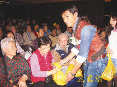 【本報訊】(記者 梁靜儀)古天樂與杜琪峰前晚隨同藝進同學會成員,出席油麻地梁顯利社區中心舉行的「油尖旺區愛心歲晚敬老同學會」,現場並有派米活動及唱歌助慶。古仔覺得派米活動很有意義,而派米只是一個形式,他希望大家在百忙中也不要忽略長者以及弱勢社群。派米後全體人一起唱《明天會更好》,不過古仔卻不時用歌詞掩面,原來他不識唱這首歌,故用來掩醜。