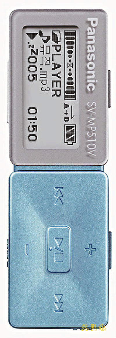 Panasonic SV-MP500V/510V系列MP3首推其別出心裁的外形設計。兩個長方形小盒左右並排的機身設計,一邊4行圖像LCD顯示屏,另一邊是電池插口及操作鍵,薄薄的機身只有23.7克,極為細小。加上有白、藍、橙、銀四款不同顏色機身選擇,適合各人的喜好。別看它機身細小,但功能齊全。除了用來播放音樂外,內置FM收音及多模式數碼錄音功能。隨機亦配備一枚可換式鋰電池,可接駁AC充電器或電腦USB充電,播放時間能長達10小時,夠晒耐力。