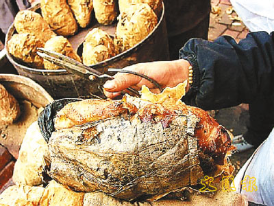 上乘的「叫化雞」烤成了。上桌時呈棕黃色,外表油亮,吃起來香氣撲鼻,酥嫩可口,真是別有風味。